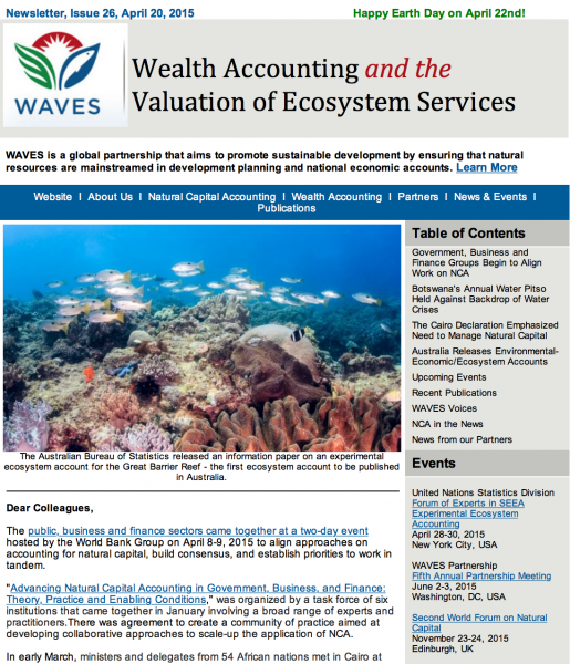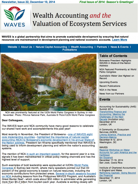 WAVES Newsletter Issue 38Launch of first global Natural Capital Protocol for business, ecosystem accounts for Central Highlands of Victoria released, and regional workshop for NCA in Africa