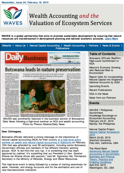 WAVES Newsletter Issue 33Groundbreaking approach to valuing reefs and mangroves, connecting the dots on using NCA, Botswana and Rwanda share NCA info