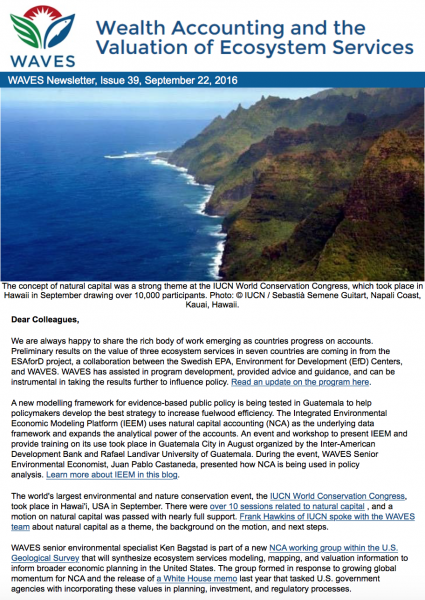 WAVES Newsletter Issue 39Seven-country study on ecosystem services, the IUCN World Conservation Congress, a new integrated model piloted in Guatemala