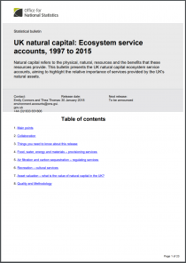 Natural capital refers to the physical, natural, resources and the benefits that these resources provide. This bulletin presents the UK natural capital ecosystem service accounts, aiming to highlight the relative importance of services provided by the UK's natural assets.